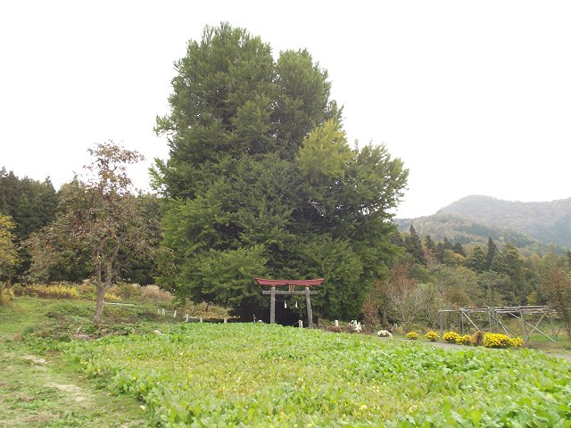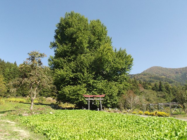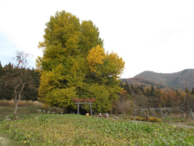 飯山市瑞穂にある県天然記念物の神戸の大イチョウ(地図)の様子。