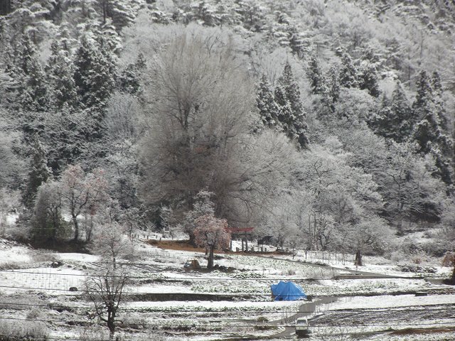 周囲の山々の紅葉、黄色に色付く大イチョウ、そして雪…。