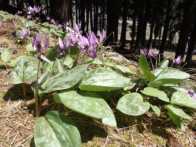飯山市五束(地図)の健御名方富命彦神別神社(たけみなかたとみのみことひこかみわけのじんじゃ)の境内では、カタクリの群生が春風に揺れています。 (写真=5日撮影、640×480拡大可能)