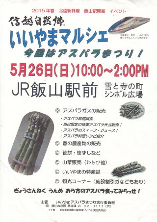 農産物・山菜の通信販売(左) 問い合わせ:道の駅千曲川内 飯山謹製堂 http://chikumagawa.net/ いいやまマルシェ 「アスパラまつり」(右) 問い合わせ:飯山市役所農林課 |