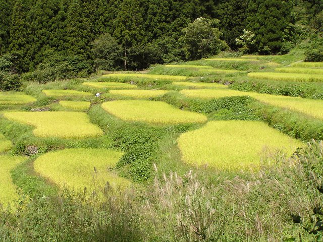 日本の棚田百選に選定されている飯山市(地図)の三辺の棚田を訪ねました。黄金色に実る稲穂の波と、その向こうを蛇行しながら流れる千曲川、そして北信五岳の山並み。神社横の駐車場から遊歩道を歩き、辿りついた先の公園から望む風景は、誰もが心のなかに描く懐かしいふるさとの原風景がそのまま残されていました。