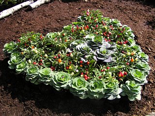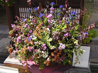 | 雁木通りでは、市民が育てた寄せ植えが多数展示 写真右側の作品はすべて飯山で栽培されている花材を使用 (りんどう・小菊・ヒペリカム・シンホリカルポス・ソリダコ・ ツルウメモドキ・ベニスモモ・ウェゲラ ナナ) 花材提供:JA北信州みゆき |