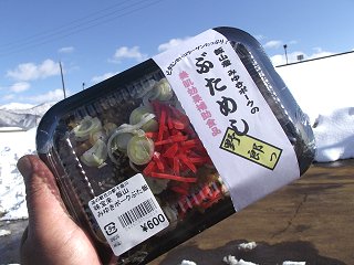道の駅千曲川の「Cafe 里わ」で販売されている、飯山産みゆきポーク使用のお弁当。その名も「ぶためし」。販売は飯山市内で笹寿司専門店を営む「ぜにがめ堂」さん。貴重なみゆきポークを使った豚肉はとろ~りとろとろの角煮に。料金は600円也。