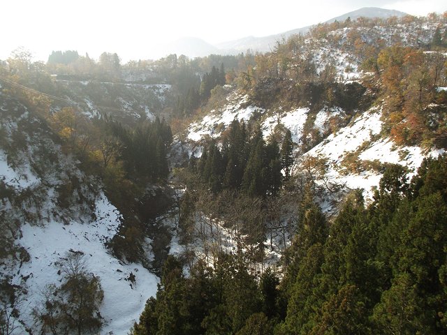 飯山市一山の出川に架かるなべくら大橋(地図)から撮影した紅葉の様子。