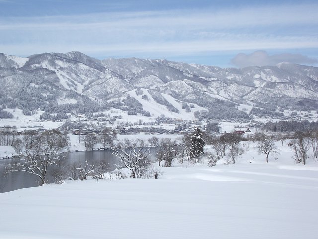 (写真:飯山市常盤の国道117号線・常盤大橋から望む戸狩スキー場周辺=5日午後撮影、640×480拡大可能)