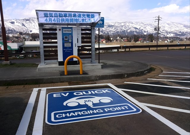 飯山市常盤の道の駅千曲川に4日、電気自動車用急速充電器が設置されました。