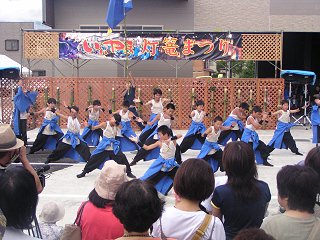 会場となった本町商店街(地図)では、午後4時から地元や周辺町村から参加したグループによる「よさこいソーラン」「信濃の国」の音楽にあわせて踊る演舞が披露されたほか、近くのぶらり広場などではペットポトルを使って作った灯篭の灯りが夏の夜を幻想的に演出しました。灯篭演出は14日も予定されています。 (写真:戸狩小学校・祭人「ごーそ」のみなさんの演舞=8日撮影)