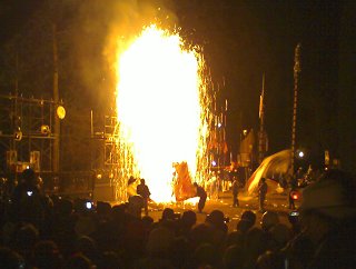 今回、くくりつけられた三国が「ぼ~ん」と音を立てて消えてしまうハプニングがありました。これまで3回この祭りを見学していますが、途中で底が抜けて消えてしまったのは初めて。これにはほんとうに驚きました