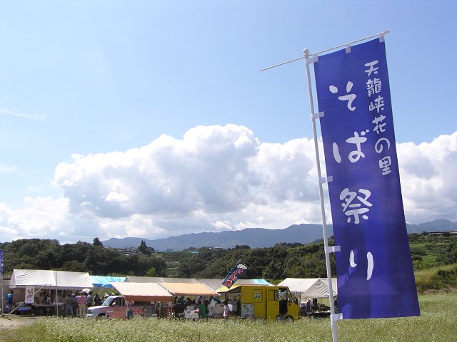 飯田市川路の天龍峡花の里(地図)では、18日から20日までの3日間、天龍峡そば祭りが開催されています。