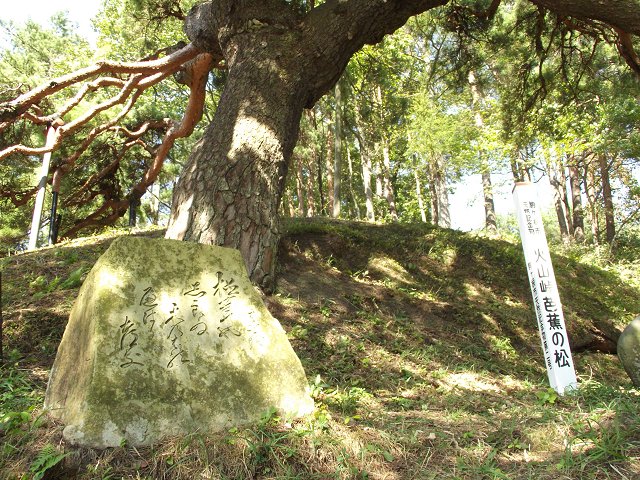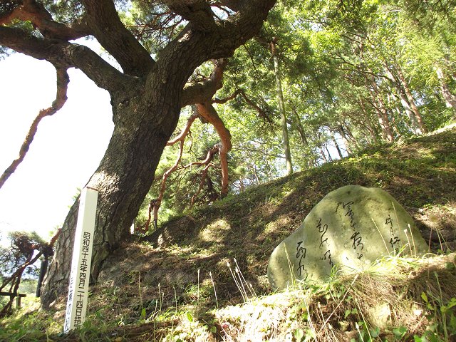 (写真:火山峠南面に残る「芭蕉の松」と芭蕉・井月句碑=12日午前撮影、640×480拡大可能)