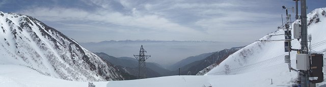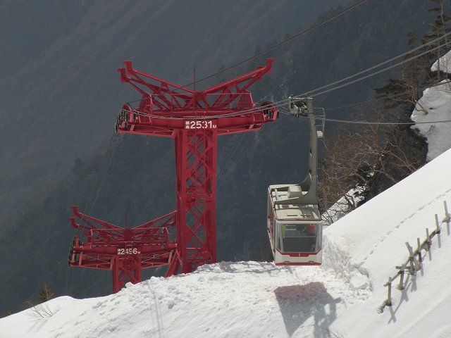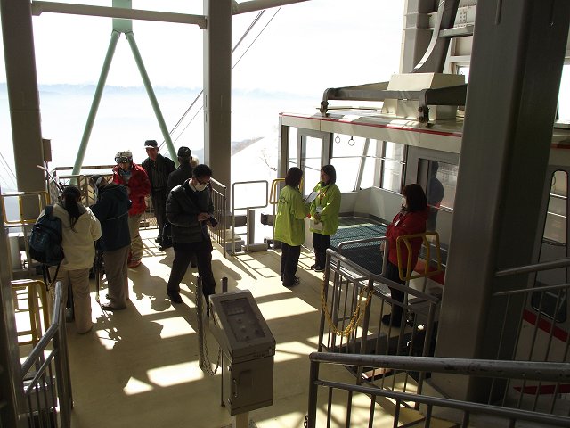 お~ここがしらび平かぁ…、とのんびりするヒマもなく、続いてロープウェイに乗車。昭和42年に完成し、平成10年にリニューアル。山麓駅(標高1661.5m)と山頂駅(2611.5m)間の標高差950.0m(日本最高)を所要時間7分30秒で、しかも通年で運行しているということです。途中には地上から120mほどの谷を渡ったり、最大傾斜60度の斜面を35度でゆっくり進んでいく場面(写真参照:搬器が斜面の雪に接触しないように、女性スタッフが無線で交信しながらスピード調整する)もあり、飛行機に乗るよりもスリル感(管理人・ひろさくは半分固まっていましたが…)のあるものでした。
