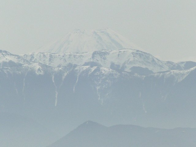 ホテル入口で受け付けを済ませ、先ずはその富士山や南アルプスの山並みが見えるテラスへ。下っていくロープウェイを見送りながらその遥か彼方に望む南アルプスの山並みをだどっていくと…、ありました、ありました、仙丈ヶ岳の左側にひょこっと見える富士山の姿(写真)が。どうみても、やっぱりあれは富士山
