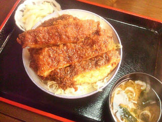 写真は「ソースかつ丼(ロース)」で値段は1000円。先ずは驚いたのは、フタが閉まらないほどてんこもりのカツ。「駒ヶ根のソースかつ丼はボリュームがスゴいよ~」とは聞いていたものの、まさかこれほどとは。お焦げがあっても、それもここのカツ丼ならではの味。ご飯たっぷりの丼にお味噌汁も付いて、これで1000円はお得…と感じました。