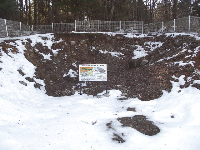 写真は十二天の森の東側にある見学場所(地図)から撮影したもの。案内図によれば、もともとはひと続きだった地層が伊那谷ならではの、東西からの大きな力が加わることで、断層により断ち切られ、西側の層の下へ東側の層が潜り込むようなカタチで「低断層崖」ができたとのこと。1994年11月に東京大学地震研究所と伊那谷自然友の会のメンバーが発掘調査を行ったところ、断層によって礫層が約5mずれていることが確認されていますので、ここでは礫層(西)が御嶽火山灰と砂からなる赤土(東)の上を覆いかぶさっている、ということになります。