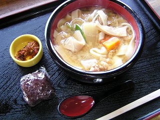 写真は、中条村の伝統料理「おぶっこ」。イベント期間中、この「おぶっこ」を注文すると、写真左下に見えるあずきのおはぎ1個がサービスにつきます。