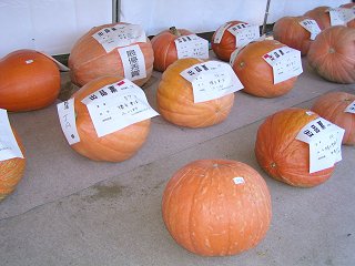 上水内郡中条村の道の駅中条(地図)で、恒例のジャンボカボチャコンクールが開催されています。最優秀賞に選ばれたのは村内の常連さんで、重さはなんと97キロ。ほかにも50キロ~60キロ台のものが並び見ごたえ十分。作品は23日まで展示されています。 (写真=20日撮影)