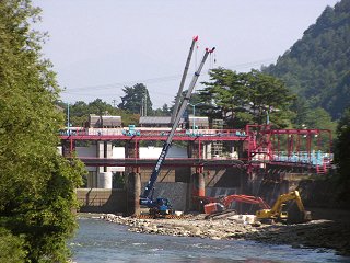 2日付の市民タイムス東筑摩版によれば、松本平に農業用水を供給する目的で昭和25年に完成した梓川頭首工が新しい施設の稼働に伴い役目を終えることとなり、1日、感謝の式典が現地( 地図 )で行われたそうです。写真は、取り壊しが始まった旧梓川頭首工の様子。 (写真=4日撮影)