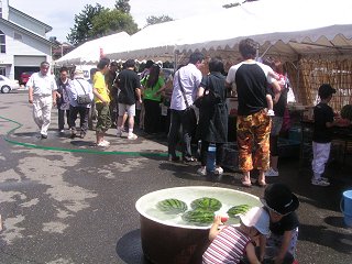 会場に設けられた販売テントでは、等階級「A」(優)L~3Lのすいかがずら~り並び、試食コーナーでは甘くてシャキとした歯応えが特徴の波田町産すいかを味わう観光客で賑わっていました。
