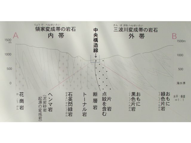 中央構造線( Wikipedia )は、関東平野から南アルプス西側を経て、紀伊半島・四国・九州へ、西南日本を縦断する日本で一番長く大きな断層。中央構造線を境に、北側を西南日本内帯(領家変成帯)、南側を西南日本外帯(三波川変成帯)と呼び区別しています。