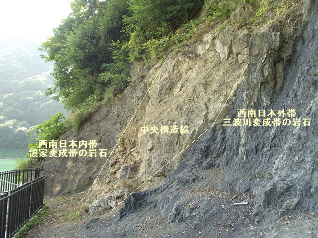 「中央構造線」は、この新しい岩石帯(明るめの茶色の岩石帯)ではなく、その両側の岩石帯(領家変成帯及び三波川変成帯)との境界部分(写真では2本の線で表示した部分)をいいます(