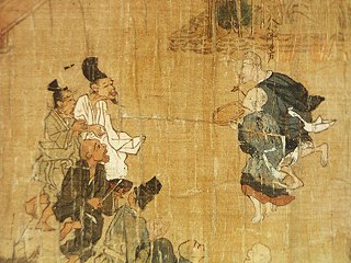 | 鉢を叩く一遍上人(左)と踊りながら念仏を唱える人々(右) 聖戒編「一遍上人聖絵」 |