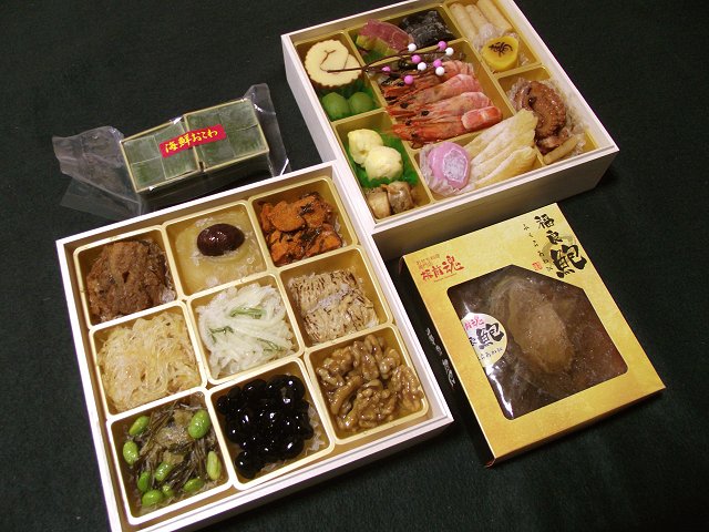 黒豆(金箔入)/真だら子昆布煮/鱈のうま煮/ふかひれ風中華くらげ/くるみ甘露煮/渋皮栗甘露煮/きんとん/焼湯葉/子持昆布山海和え/紅白なます