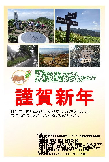 今回の年賀状は、なかなか機会がなく、これまで参加できなかった地元の里山(虫倉山・飯綱山)の記念登山イベント、ウォーキングイベント(第24回諏訪湖一周ウォーク)への参加、ひさしぶりに家族旅行を楽しんだ能登半島和倉温泉、そして福島県いわき市に向かう途中、以前から訪ねてみたかった「勿来(なこそ)の関」の5つのスポットを厳選して取り込んでみました。