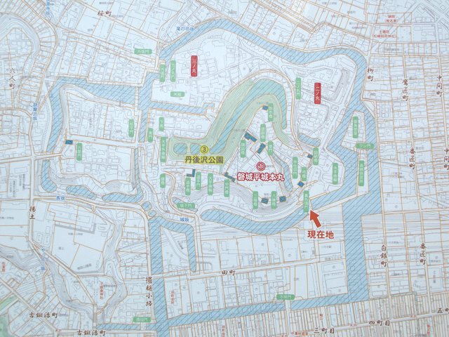 JR常磐線高萩駅→高萩観光案内所メモリア→長久保赤水銅像→(4700m、徒歩約60分)→※北宿並木一本松跡→穂積家住宅(高萩茶寮)→(1500m、徒歩約20分)→※竜子山城跡本丸→松岡小学校郷土資料室就将館→(100m、徒歩約2分)→アプローチ広場→(100m、徒歩4分)→丹生神社→(3500m、徒歩約45分)→JR常磐線高萩駅